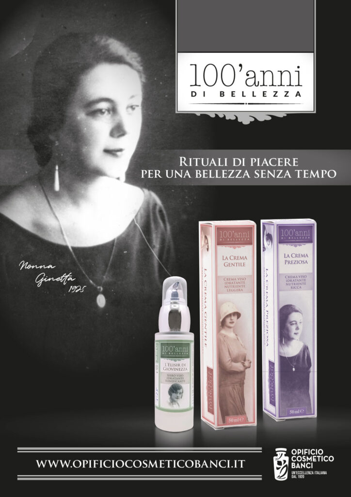 100’anni di bellezza è una linea di cosmetici naturali chesi ispira ai prodotti di inizio secolo scorso, quando il cosmetico era connotato da nomi fantasiosi ed evocativi che raccontavano raffinati rituali di cura del corpo, figure e personaggiparticolari, storie di vita quotidiana.